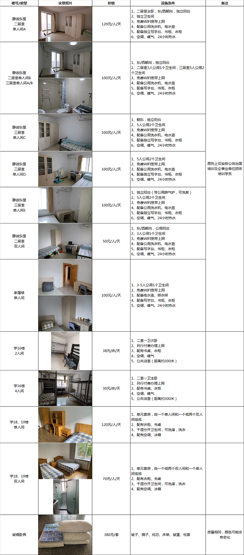 3. 学员请自备被褥卧具,或采购我校提供的被褥卧具,380元/套。清单:被子、褥子、枕芯、床单、被罩、枕套,质量相同,颜色可能会有变化。